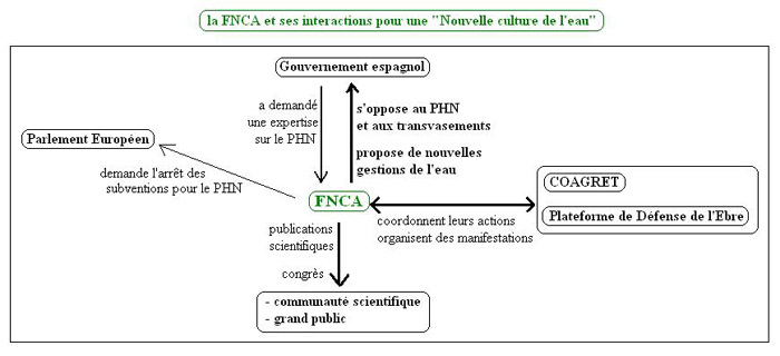 Elle travaille aussi avec les associations environnementales comme COAGRET ou la Plateforme de défense de l'Ebre (PDE) pour s'opposer aux transvasements. La FNCA est un des organisateurs de la « Marche Bleue », manifestation partie des sources de l'Ebre pour remonter jusqu’au Parlement Européen à Bruxelles…