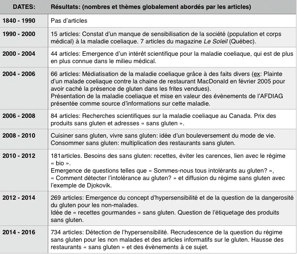 On remarque que le sujet du « sans gluten » a émergé dans la presse de façon marquante dans les années 2000, et a été particulièrement discuté à partir de 2014.